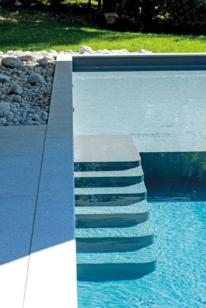 Au-delà de ses caractéristiques esthétiques, la pierre de Cogne a été choisie pour sa provenance. Le piscinier a confié que pour ses différents projets, il travaillait beaucoup (tout comme ses confrères) avec des matériaux de ses voisins transalpins, en raison de sa proximité avec la frontière. Bien qu’intégrée à la nature, la piscine garde son esthétique moderne, inspirée de la maison, avec sa membrane gris anthracite ainsi que ses pièces à sceller en inox apportant une touche contemporaine.
