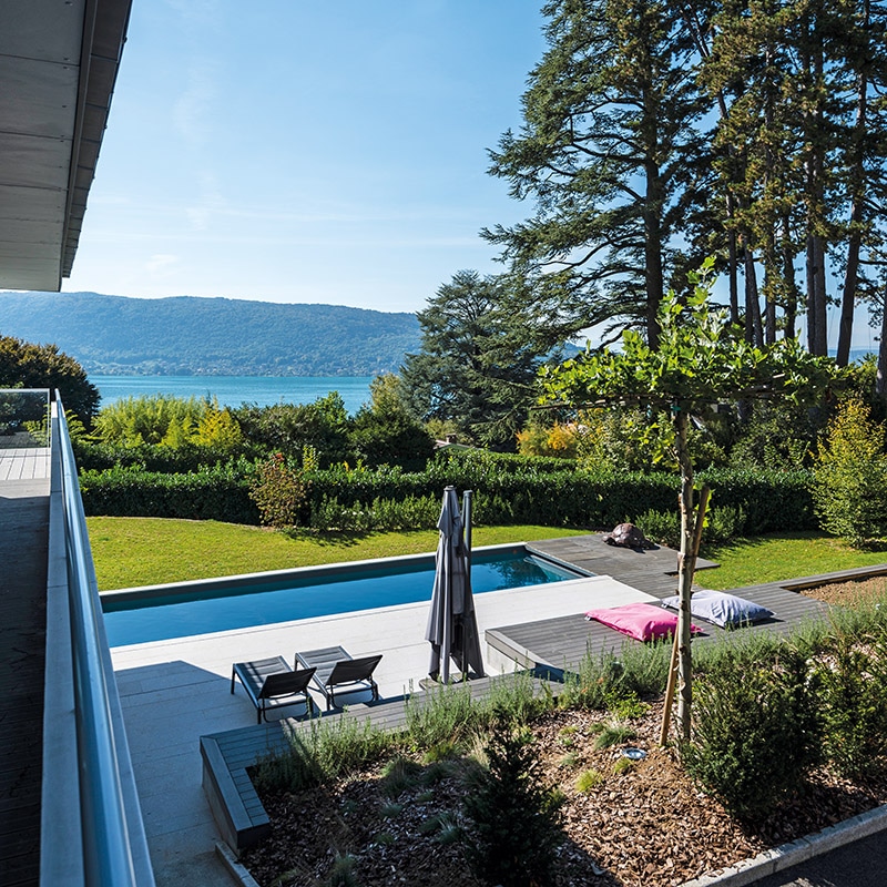 Que l’on se trouve sur un des différents balcons de cette maison d’architecte ou accoudé sur la margelle de son élégant bassin, la beauté du lac d’Annecy se dévoile et s’admire grâce à une vue dégagée.