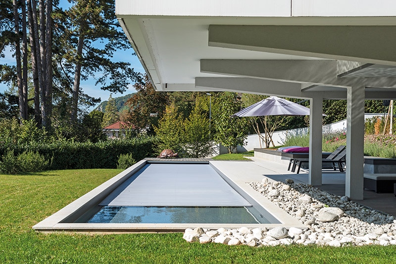 Le volet automatique de sécurité est immergé et dissimulé dans un coffre recouvert d’une terrasse en caillebotis, renforçant l’alliance de la nature et de la modernité.