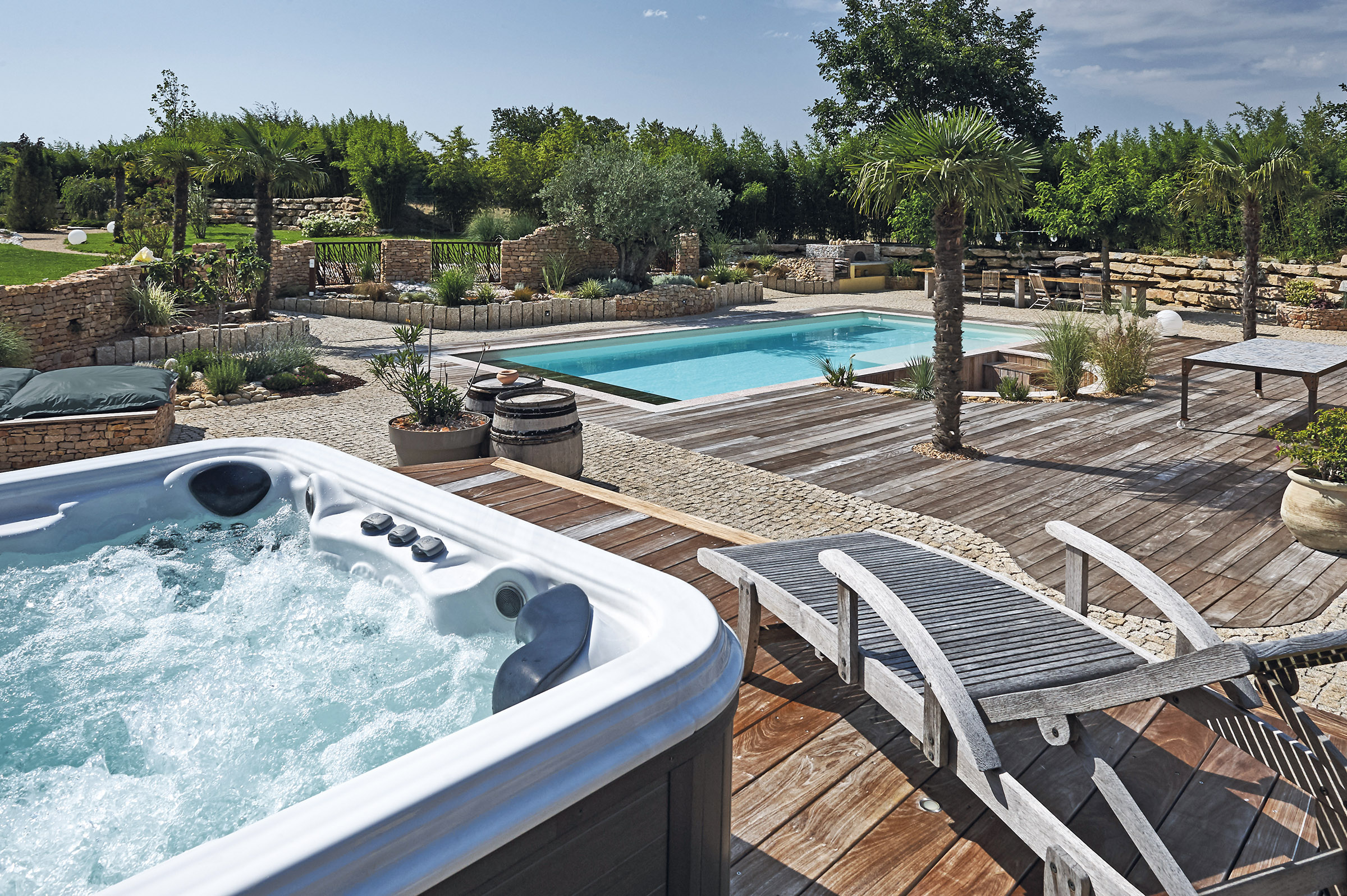 L’esprit de convivialité, de fête, de réunion familiale souffle ainsi sur chaque élément de cette réalisation. Le vaste coin repas à l’abri des arbres avec son four en pierre est un autre spot où il fait bon vivre. L’espace détente, matérialisé par de larges poufs, est tout aussi accueillant. Et sur le podium, le spa et ses cinq places de massage dont une allongée offrent toute l’année les plaisirs de l’eau entre amis ou en famille.