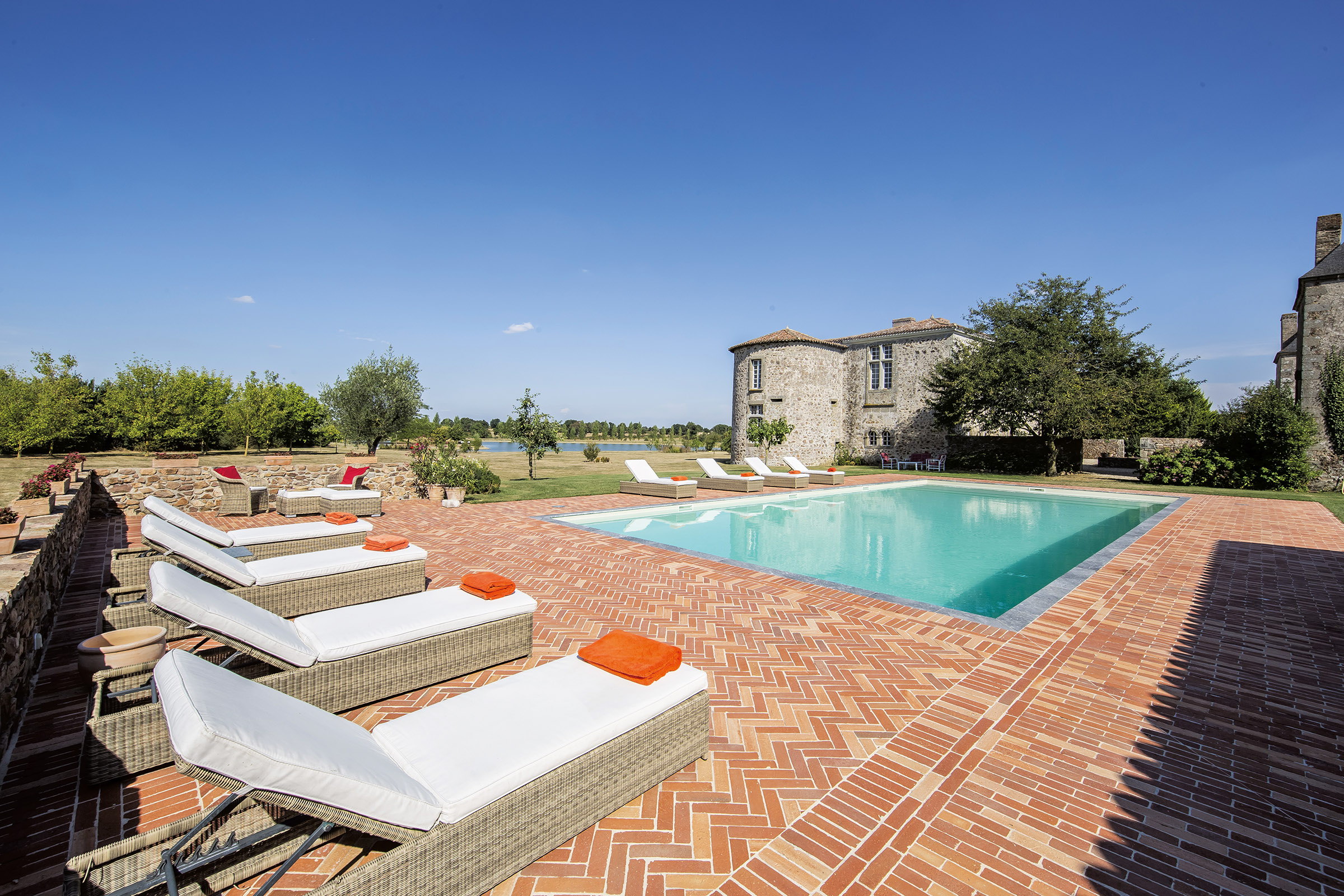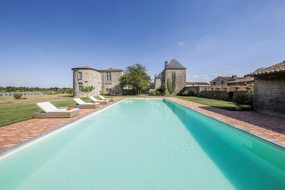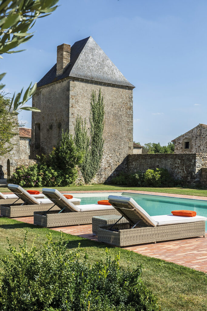 Le vieux logis du XVIIe siècle s’accorde une avancée contemporaine en accueillant une vaste piscine cernée d’un parterre de tomettes, original et unique.
