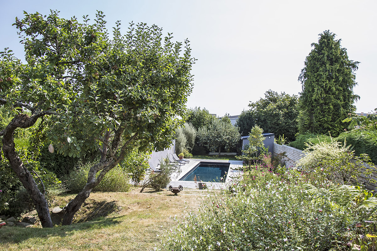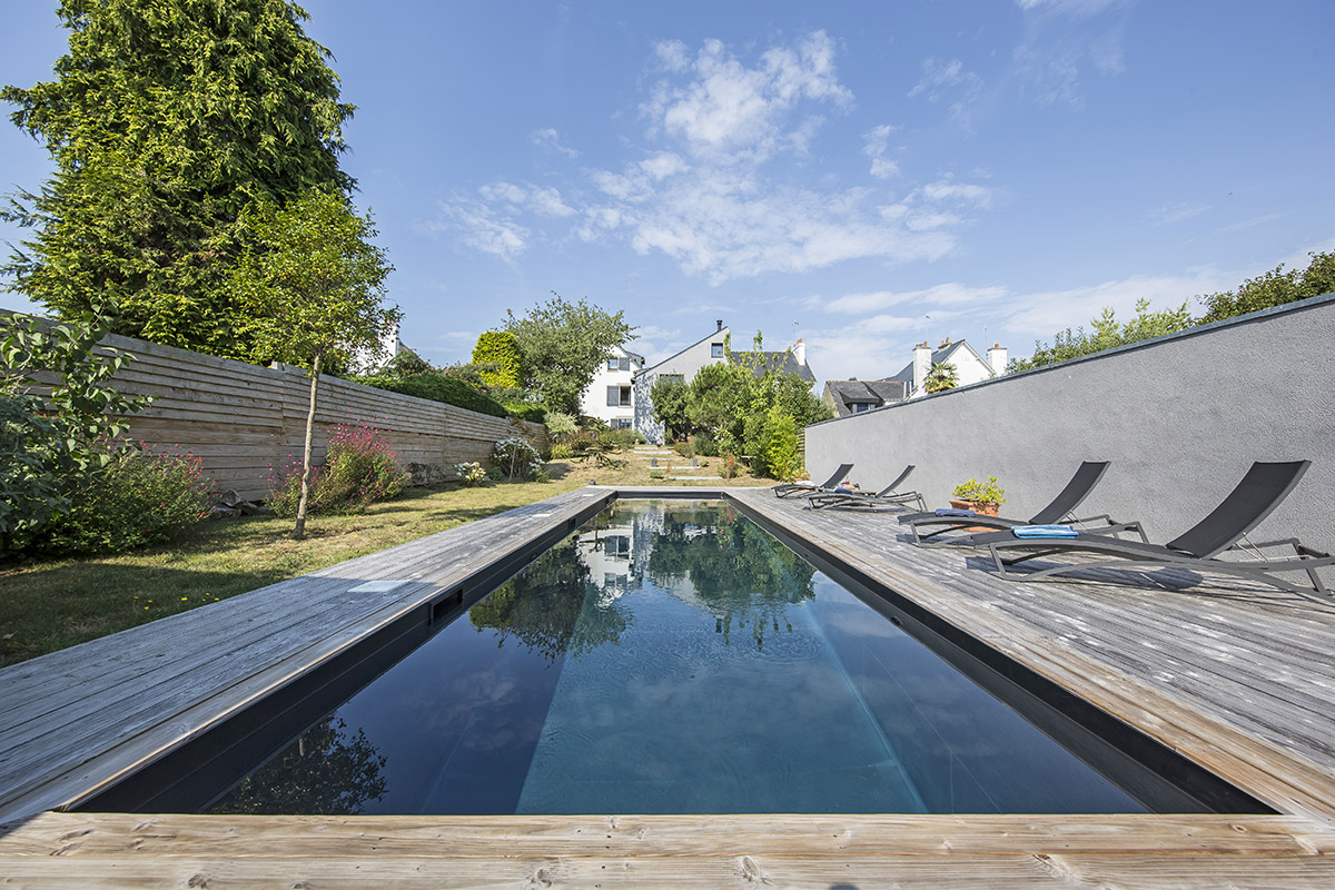 Située en limite du centre-ville de Vannes, la maison récemment acquise dispose d’un grand jardin de ville. De quoi y implanter un bassin selon le souhait des propriétaires, qui signent là leur deuxième projet de piscine. L’expérience aidant, la maison est dissociée de la piscine afin de l’éloigner des bruits occasionnés par son utilisation, et ce pour la tranquillité de tous, y compris du voisinage. Longue et étroite mais orientée sud-sud-ouest pour un ensoleillement maximal, la parcelle ne laissait pas beaucoup d’autres choix qu’un couloir de nage. Ce dernier répond cependant aux goûts sportifs de ses utilisateurs, avec un bassin en pente allant de 1,40 m à 2,20 m qui autorise les plongeons les plus audacieux !