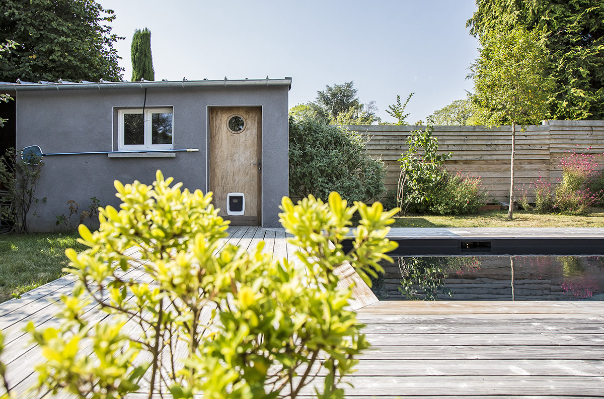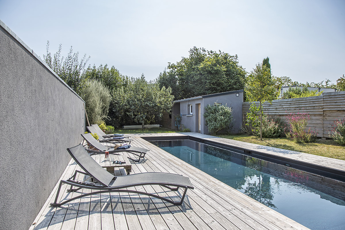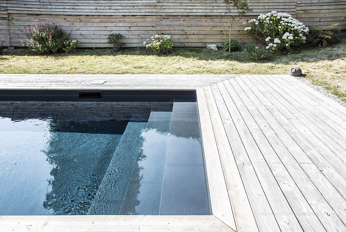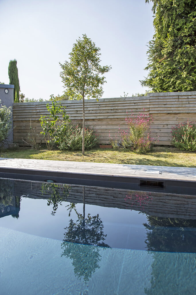 Les propriétaires ont opté pour une plage en bois exotique qui optimise la circulation autour du bassin en cas d’éclaboussures. Un choix orienté par leur expérience précédente, en lieu et place d’un carrelage froid et glissant. La plage fait écho aux palissades qui entourent l’écrin de la piscine.