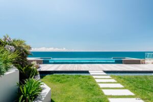 Aussi moderne soit elle, la piscine de douze mètres par cinq devait néanmoins rester discrète afin de s’intégrer parfaitement à son environnement et de ne pas voler la vedette au paysage. Le choix d’un revêtement en membrane armée de couleur sable et texturée donne à l’eau un effet de pierre naturelle, en prolongement parfait avec celle de la pierre de travertin qui entoure le bassin sur sa terrasse et en margelles. L’environnement minéral de la plage extérieure donne ainsi l’impression d’être prolongé dans le bassin.
