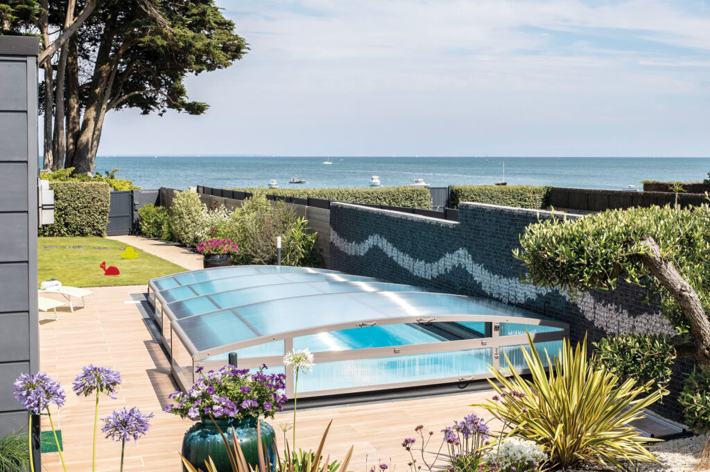 Conserver l’esthétique du lieu est un souci majeur lors de l’installation d’un abri de piscine. Dans cette région de Bretagne, bordée par l’océan, sur la presqu’île de Quiberon, la piscine s’impose à la vue entre la maison et la mer. L’abri devait alors s’intégrer dans le paysage, sans empiéter sur le panorama. La mise en place d’un abri « Stretto », discret, a été choisie pour ses modules bas entièrement rétractables en bout de bassin, constitués de panneaux de polycarbonate alvéolaire à courbes tendues, et de parois latérales transparentes. Particulièrement bas et légèrement galbé, l’abri s’insère avec discrétion dans la mise en scène du jardin.