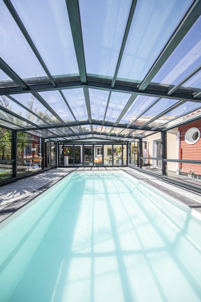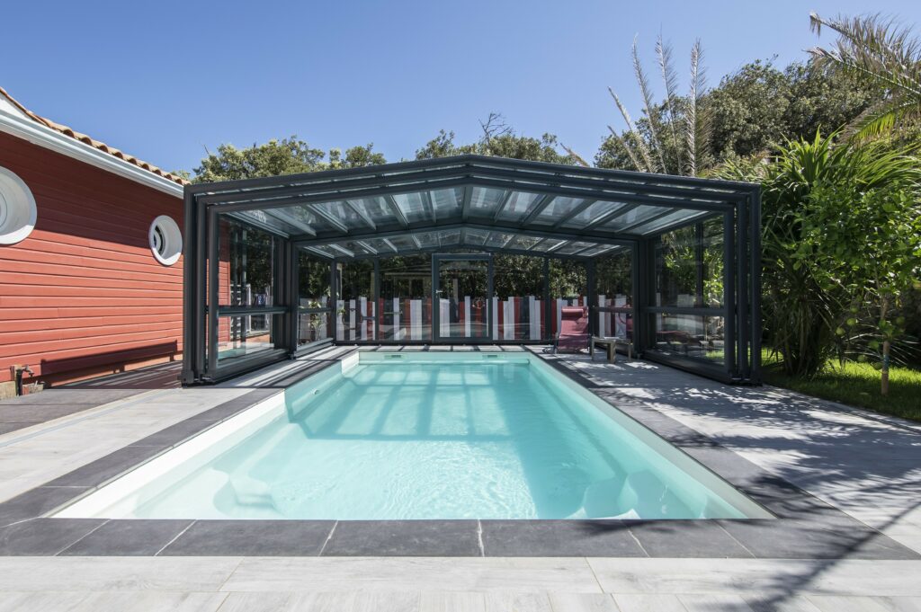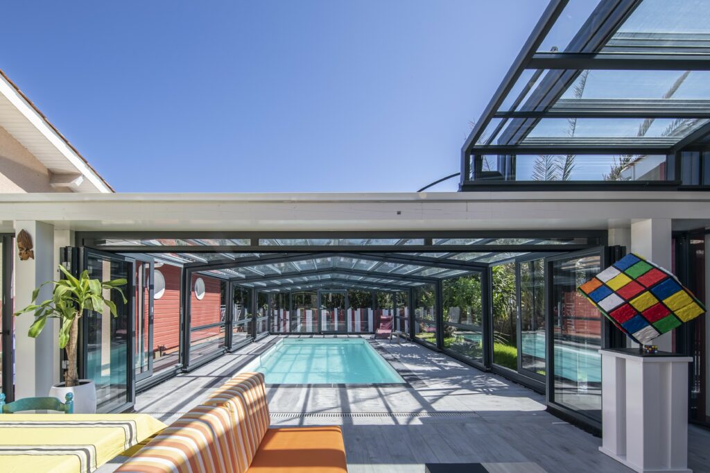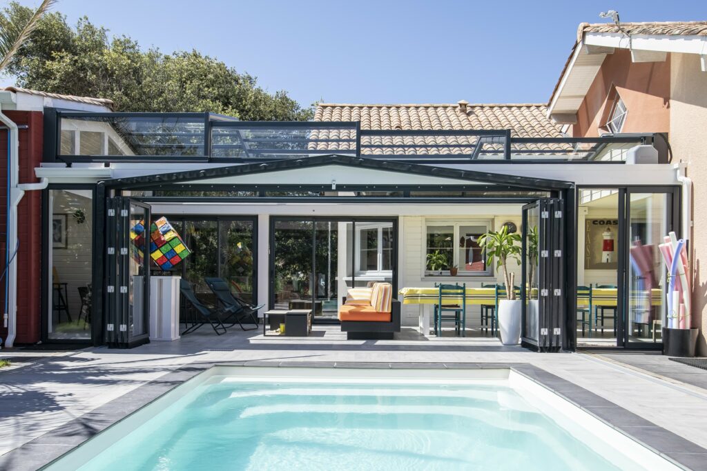 La réalisation combinée d’un abri au-dessus d’une piscine et d’un abri en toiture permet la création d’un nouvel espace de vie accolé à la maison. Le gain de pièce est immédiat, à ouvrir ou à fermer pour vivre ou non en extérieur.