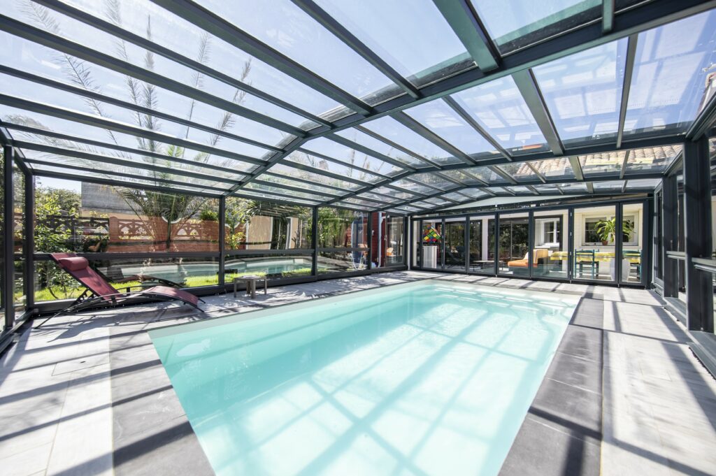 Cette installation ne joue pas seulement le rôle d’abri, elle valorise le bassin et donne l’impression d’une piscine intérieure, répondant au souhait des propriétaires de pouvoir vivre à l’extérieur comme à l’intérieur toute l’année.