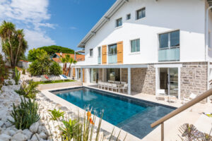 Après consultation, la forme libre s’est avérée être la plus adaptée, celle qui permettait d’exprimer au mieux la créativité du projet. Le bassin est revêtu d’un enduit minéral couleur sable, à base de cristaux de quartz à l’origine d’une impression d’eau vive. L’idée était de créer un espace piscine ludique divisé en plusieurs zones, chacune dévolue à une envie particulière. Semblable à une étendue de sable fin, la plage immergée est une entité indépendante « séparée » de la piscine lagon par un escalier. Surdimensionné, le bassin permet une amplitude de nage qui peut laisser croire qu’on se trouve en mer. Bien que débordant, le spa est surélevé par rapport au bassin et possède son propre accès. Composé de 4 jets de massage, il est le compagnon idéal pour se prélasser après avoir enchaîné des longueurs matinales.