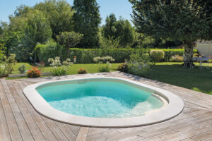 Abords : Margelles en pierres naturelles, dalles en marbre pour le débordement, plages en bois