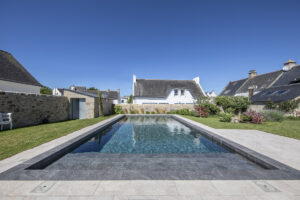 Cette piscine traditionnelle s’offre une couverture des plus modernes sur le marché. Fine et élégante, ultra-technique et automatique, elle couvre et découvre lentement le bassin à l’image du flux et du reflux des marées bretonnes.