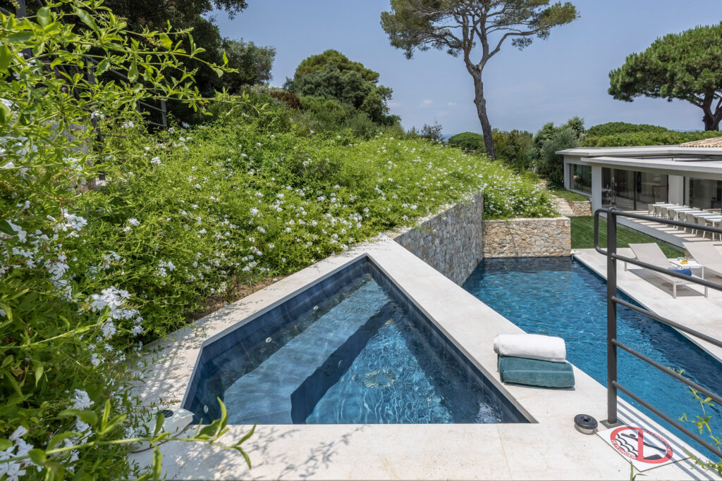 Implantée sur un terrain en pente, surplombant la splendide baie de Saint-Tropez, cette villa tropézienne avec sa piscine spa offre une expérience de vie incomparable.