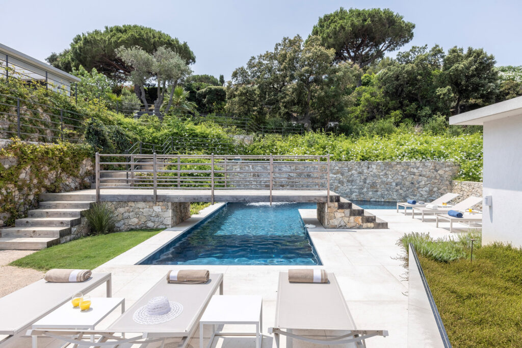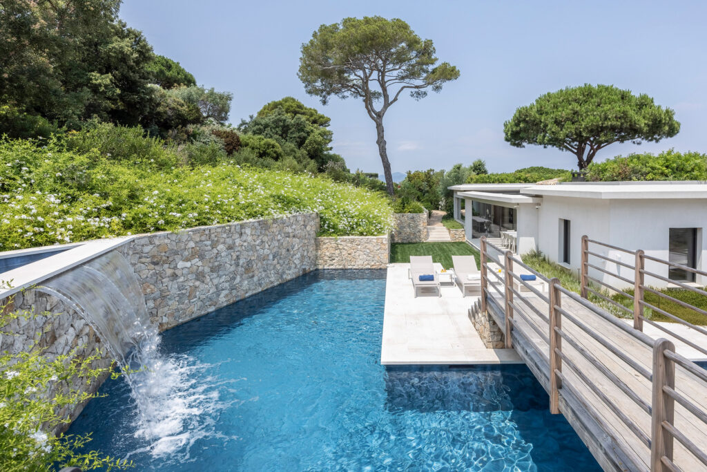 En contrebas, la piscine invite à la baignade, entourée de végétation verdoyante. Avec ses espaces de détente aménagés en solarium, cet endroit est idéal pour se prélasser et rêvasser. Il a été conçu pour évoquer une véritable pièce de vie, reliée à la maison par de grandes dalles de pierre claire, en harmonie avec la façade. Les murs en restanques et le pont au-dessus de la piscine ajoutent une dimension architecturale à l’espace.