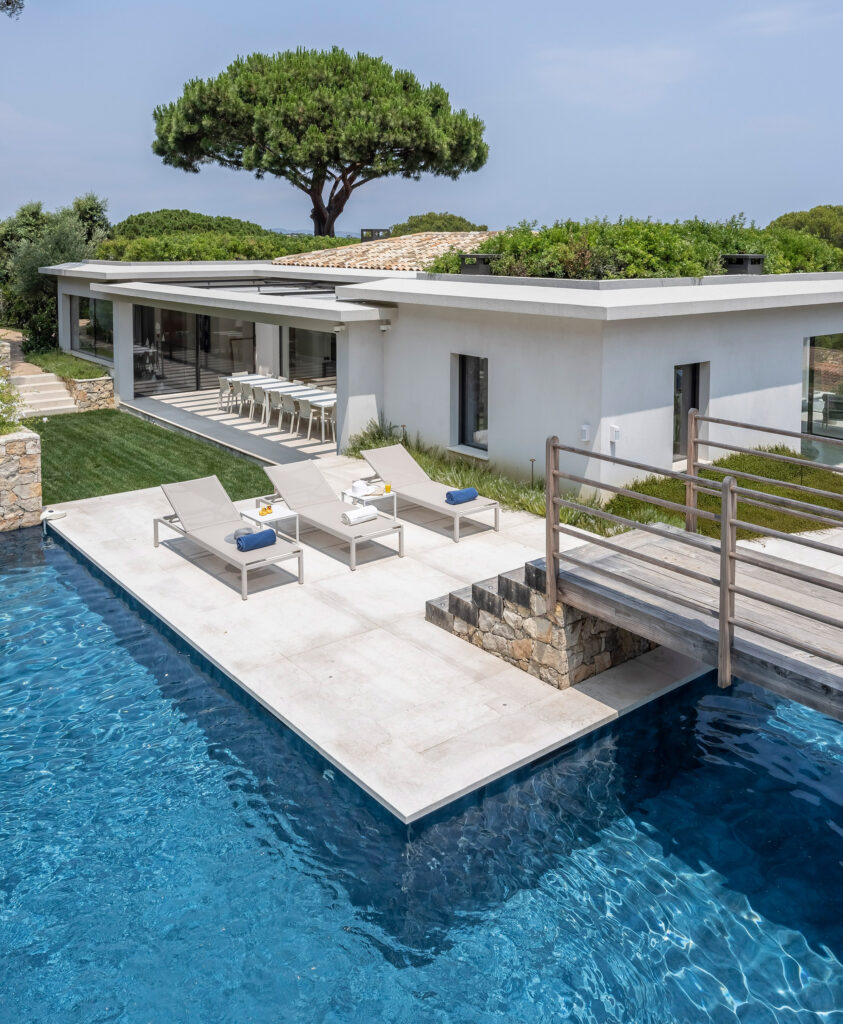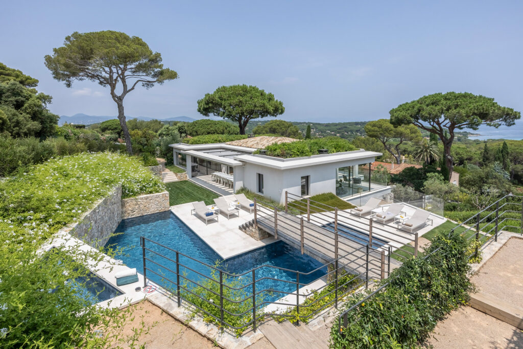 Construite dans un style contemporain, la villa dispose de plusieurs terrasses et d’un séjour d’été abrité sous une pergola, idéal pour déjeuner à l’ombre. Les vues depuis la piscine et la maison restent dégagées grâce à l’installation de garde-corps en verre.