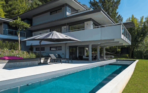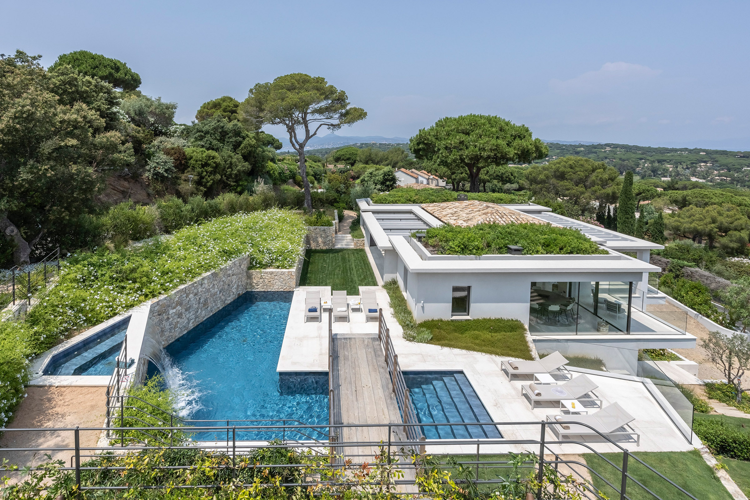 Construite dans un style contemporain, la villa dispose de plusieurs terrasses et d’un séjour d’été abrité sous une pergola, idéal pour déjeuner à l’ombre. Les vues depuis la piscine et la maison restent dégagées grâce à l’installation de garde-corps en verre.