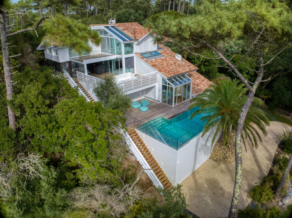 De forme simple, cette piscine d’une villa située à Hossegor masque sa complexité derrière une esthétique originale, en parfaite adéquation avec son environnement immédiat. Découvrez cette rénovation piscine originale et singulière