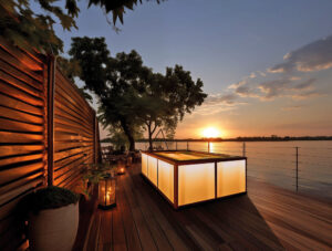 Le bassin est chauffé grâce une pompe à chaleur Full Inverter et protégé par un volet roulant dissimulé dans un coffre immergé. Dès la tombée de la nuit, 8 projecteurs Leds de couleur mettent en scène le couloir de nage et créent une toute nouvelle ambiance, unique.