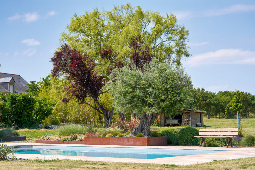 La rénovation de cette maison, située au cœur de l’Anjou, a incité les propriétaires à valoriser leur jardin et à créer un espace piscine et spa. Tout en respectant l’existant, en s’y adossant même pour conserver sa cohérence au lieu, Erwan de Boislaville et son équipe ont travaillé en plusieurs étapes. La première consistait à imaginer et réaliser une piscine susceptible d’accueillir toute la famille, enfants et petits-enfants. Volontairement proche de la maison et prenant place sur une prairie à l’origine en pente qui a été reprofilée, un grand bassin rectangulaire répond aux critères voulus et voisine avec un spa, semi-encastré. « Sa verticalité permet de cloisonner les espaces et de créer des zones de cocooning » explique Erwan De Boislaville. Elle fait également un clin d’œil aux jardinières en acier Corten. La plage et la terrasse, aux belles dimensions, jouent sur la dualité des matériaux. Si l’une mise sur du grès multicolore d’aspect rustique, l’autre apporte à l’ensemble une touche de légèreté grâce à son bois exotique. Le choix d’installer des bancs au bord de la piscine renforce l’effet détente du lieu et casse le rythme, tout en douceur. Ils invitent à des moments de pause, où l’on prend le temps de profiter de la vue.