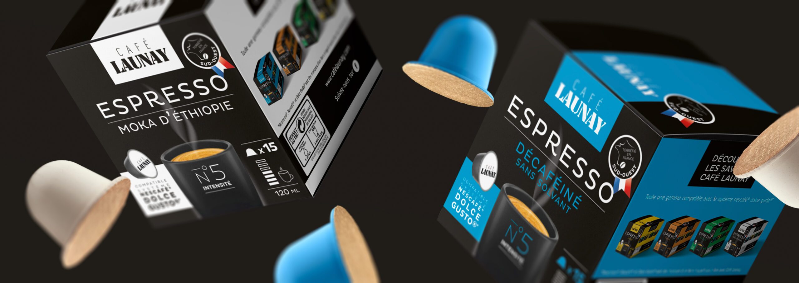 En 2019, Café Launay lance gamme de capsules bio, compostables et biodégradables, ne contenant pas d’aluminium, et compatibles avec le système Nescafé Dolce Gusto. Réalisant l’intégralité des packs pour Café Launay, l’Agence Nature a su exprimer l’arôme puissant de chaque cru de café, ainsi que le côté Premium de cette offre originale.